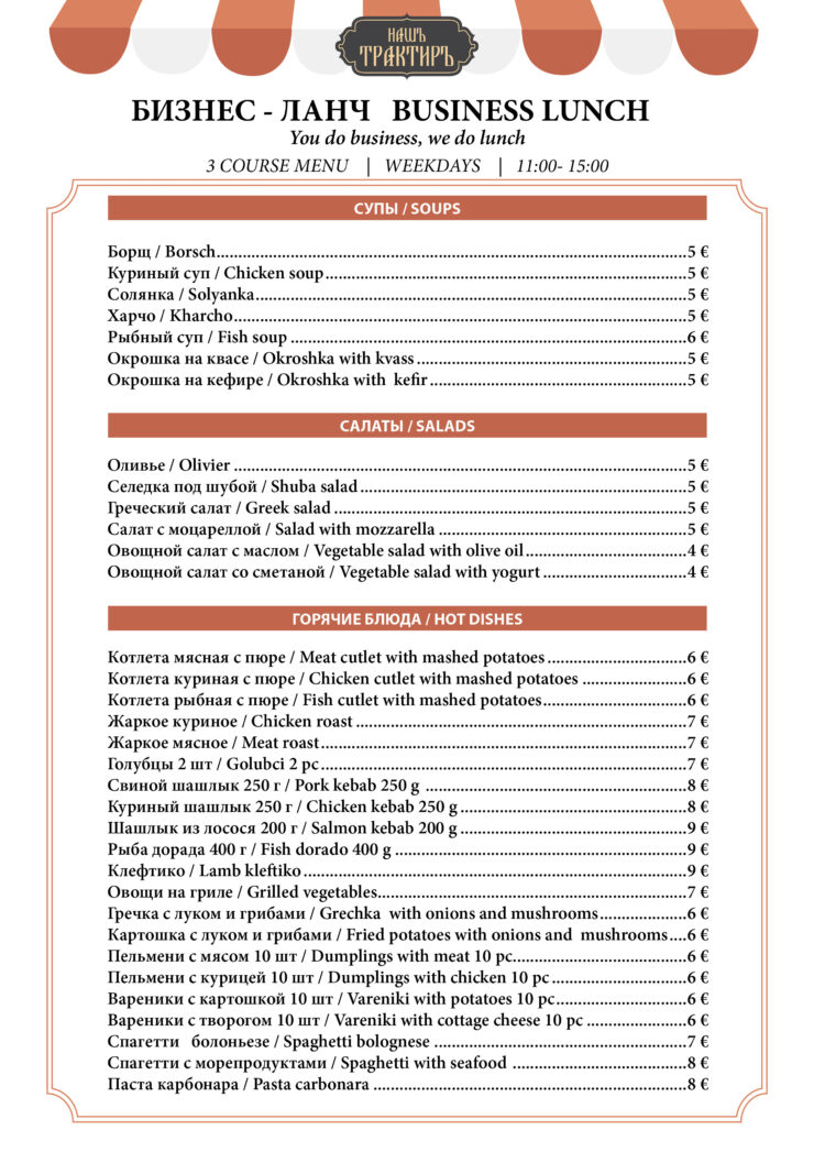 «Наш трактир» в будние дни с 11:00 до 15:00 также предлагает меню «Бизнес-ланч» — вы можете вкусно пообедать по выгодным ценам.